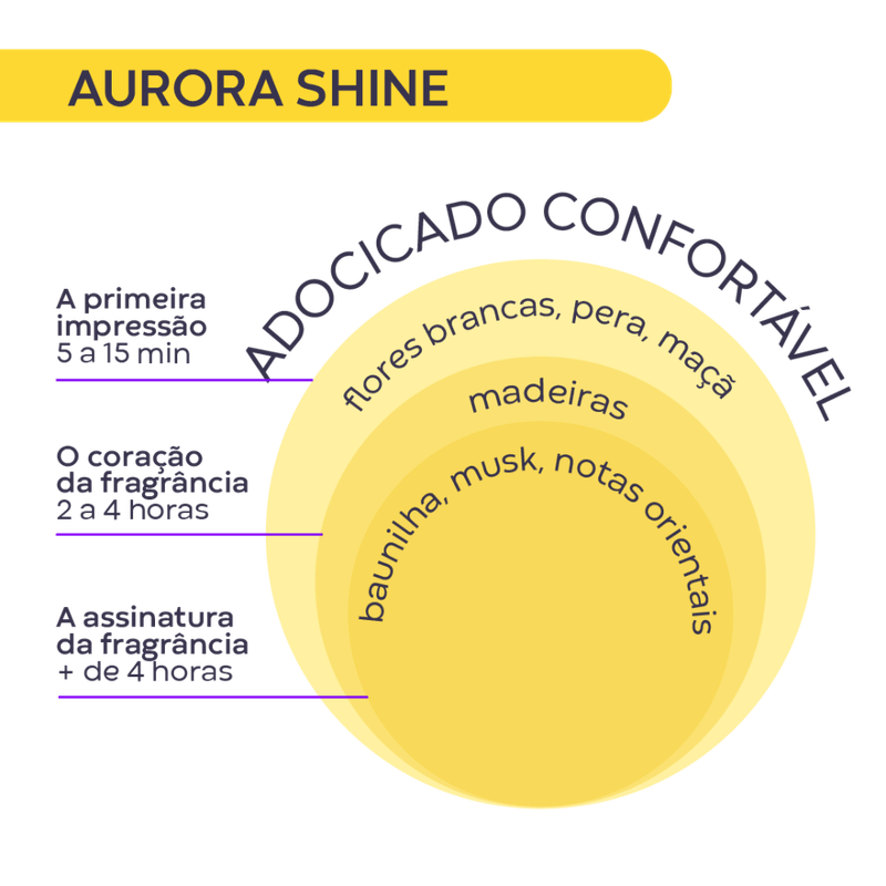 Digna de uma Deusa, a fragrância Aurora Shine te transporta ao Olimpo, capturando a luminosidade e a energia celestial de cada momento. Sinta-se envolvida pelas flores brancas em sua saída, que evocam toda a sua pureza e elegância. O corpo revela suas notas amadeiradas, criando uma fusão enigmática que adiciona mistério à fragrância. Suas notas de fundo combinam a doçura reconfortante da baunilha com a profundidade do almíscar e do acorde oriental, deixando um rastro irresistível e luminoso, por onde você for.