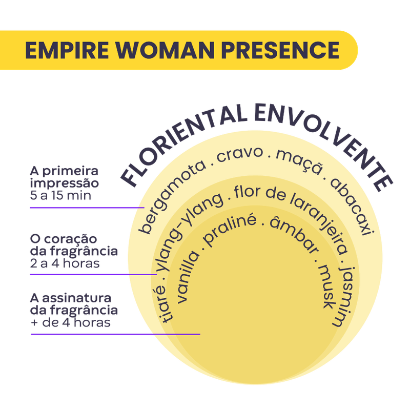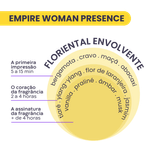 Por ser um Deo Parfum, o Empire Woman Presence possui uma alta concentração de essência, o que garante uma fixação e projeção prolongadas na pele, ideal para deixar um rastro inesquecível.