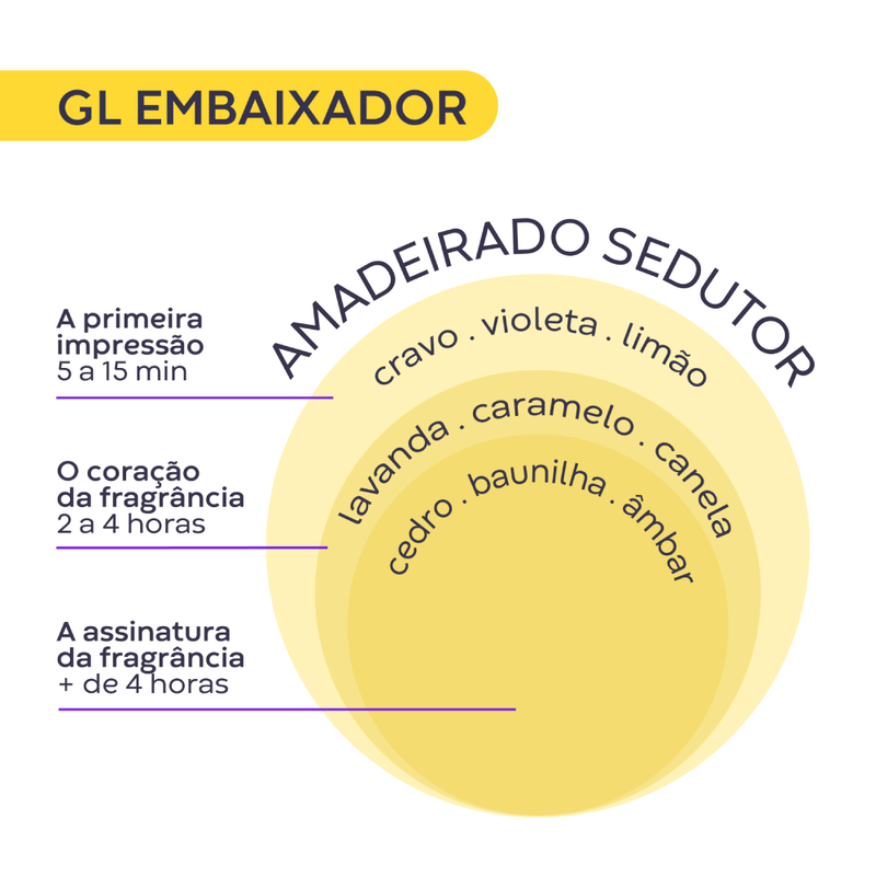 GL Embaixador Gusttavo Lima é uma fragrância sedutora e marcante. Com uma abertura cítrica e fresca, combina notas de âmbar e madeiras intensas para provocar e despertar o desejo, enquanto especiarias, como a canela, finalizam o acorde poderoso, quente e sedutor.