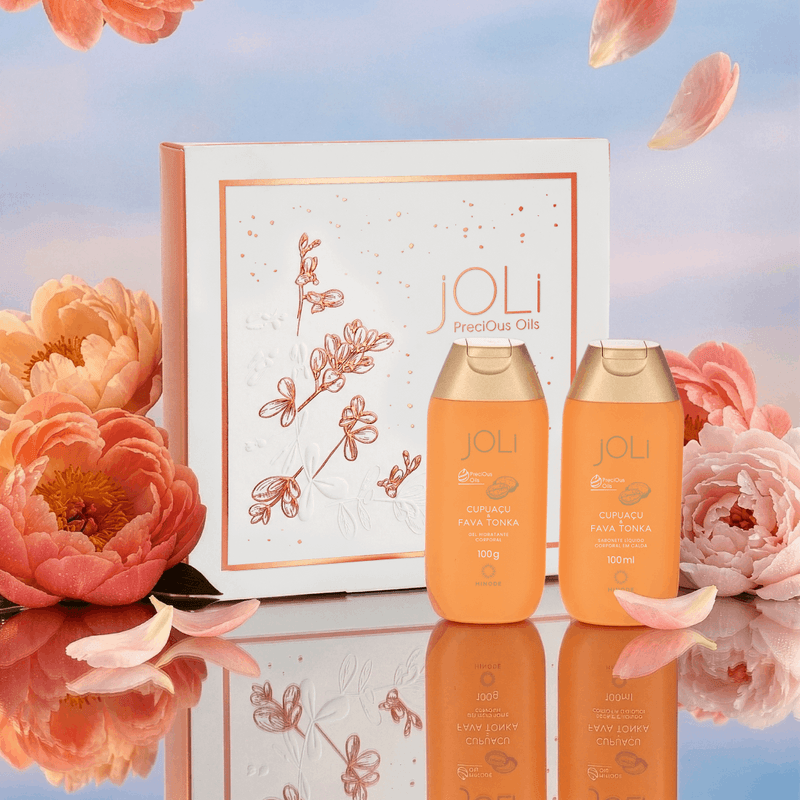 O kit é composto por três itens essenciais para o cuidado corporal: um Óleo em Creme Joli Cupuaçu e Fava Tonka de 200ml, um Óleo Desodorante Corporal Joli Cupuaçu e Fava Tonka de 200ml e um Creme para as Mãos Joli Cupuaçu e Fava Tonka de 50g.