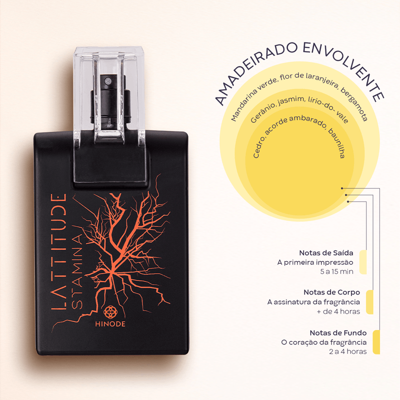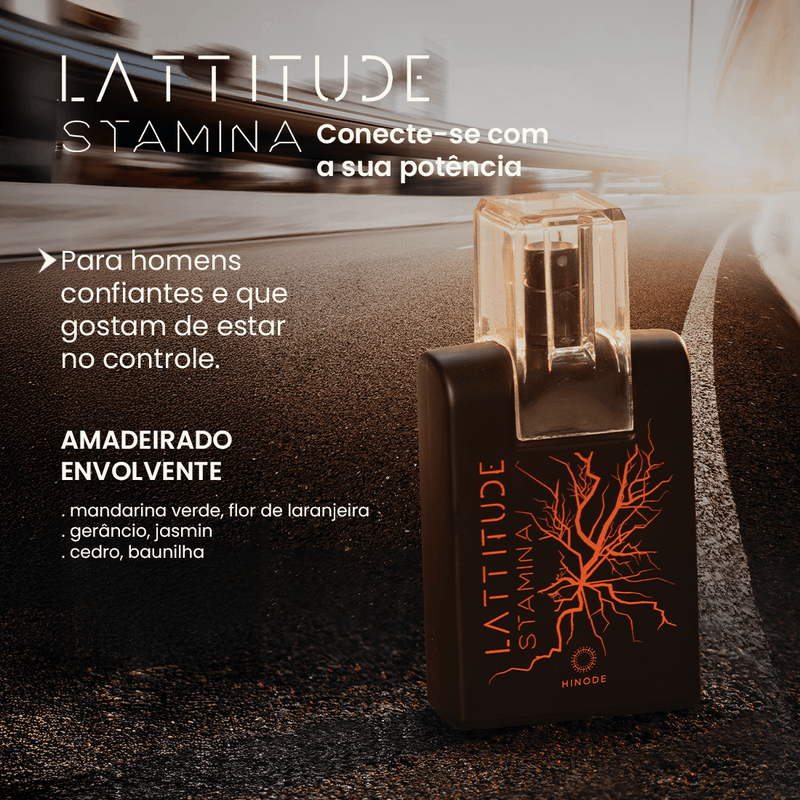 Parte da icônica linha Lattitude, a fragrância Stamina é categorizada na família olfativa Fougère Vibrante, uma combinação que reflete frescor e poder. Seu acorde robusto é construído sobre notas de pimenta preta e bergamota no topo, que se fundem em um coração amadeirado intenso. Esta composição de alta performance é projetada para uma projeção notável e duradoura, traduzindo a atitude de quem está sempre em movimento.