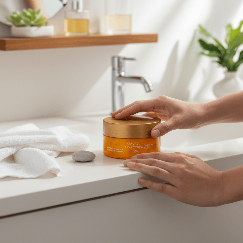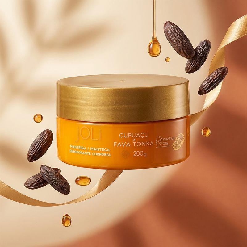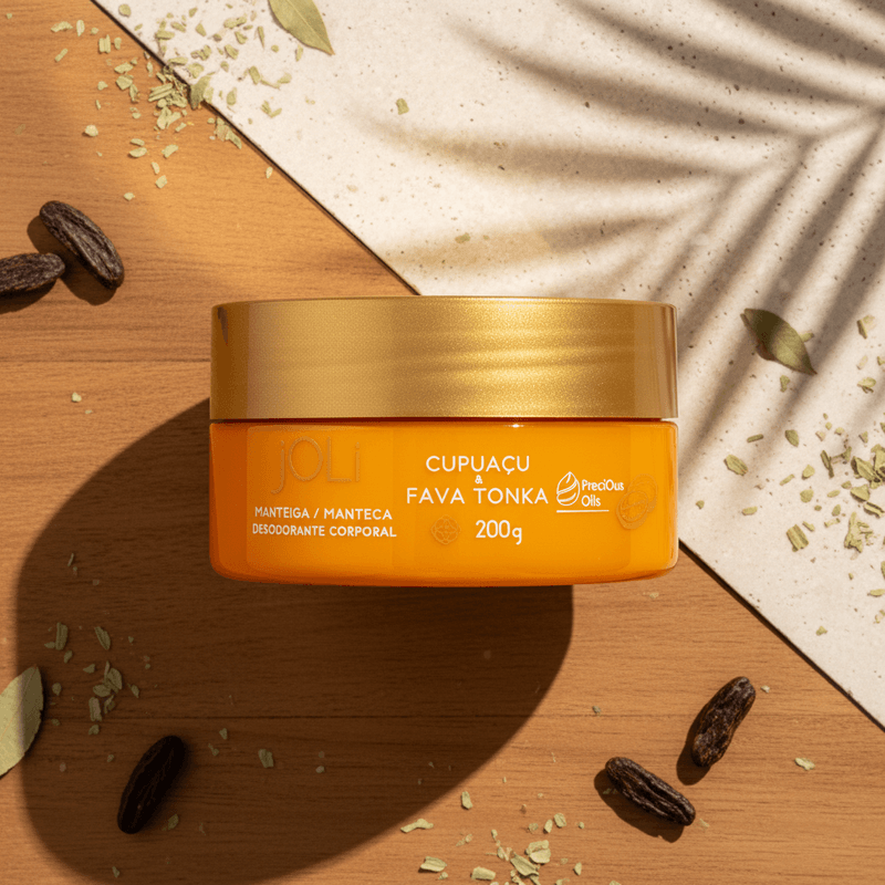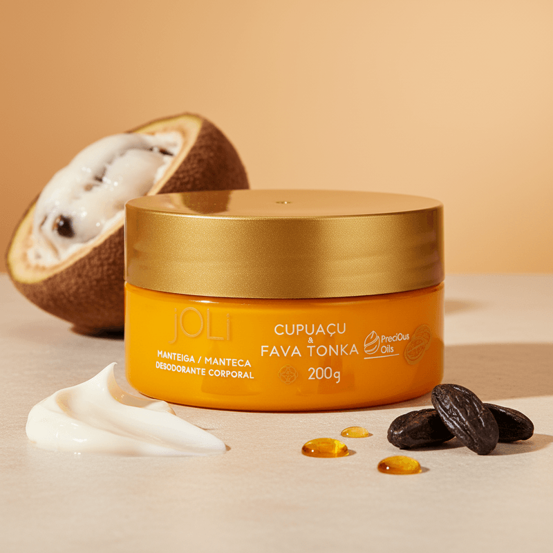 A Manteiga Corporal Joli se destaca pela presença do Cupuaçu, conhecido por suas propriedades emolientes e alta capacidade de retenção de umidade, e da Fava Tonka, que auxilia na nutrição e perfumação da pele.
