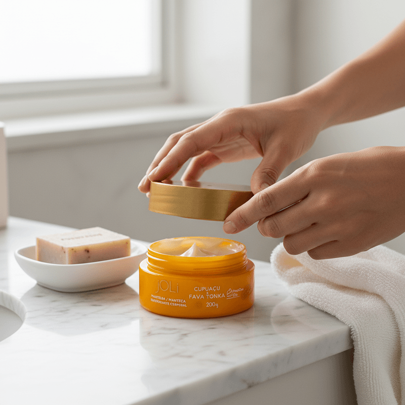 Permita-se esse ritual de beleza diário e sinta a diferença de uma pele visivelmente renovada e radiante. Aplique a Manteiga Corporal Joli Cupuaçu e Fava Tonka com movimentos suaves, transformando o cuidado em um momento de bem-estar. Garanta o seu frasco e revele uma pele intensamente hidratada, nutrida e com o aroma irresistível da linha Joli.