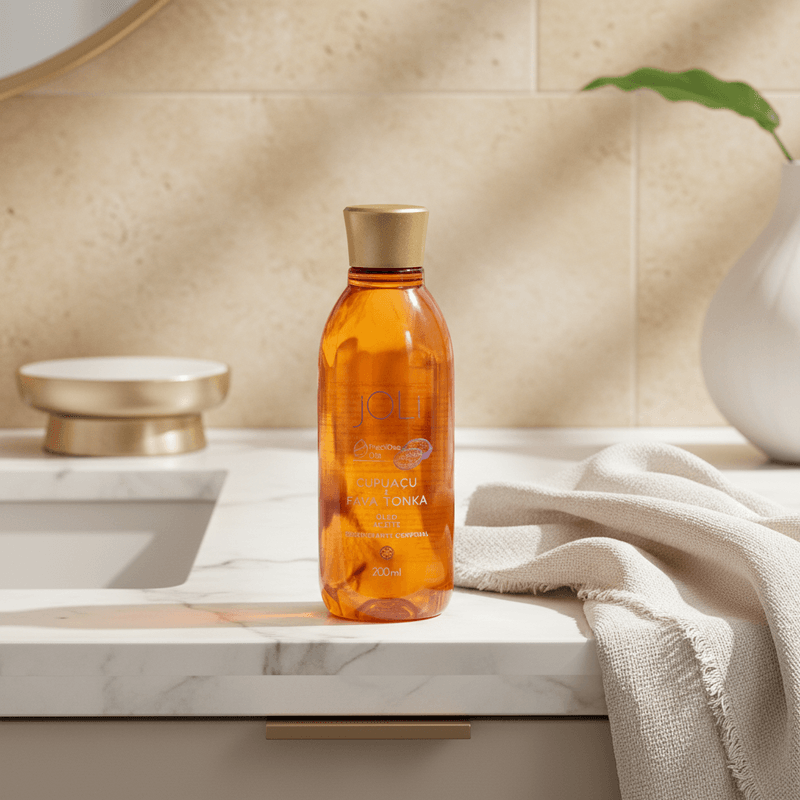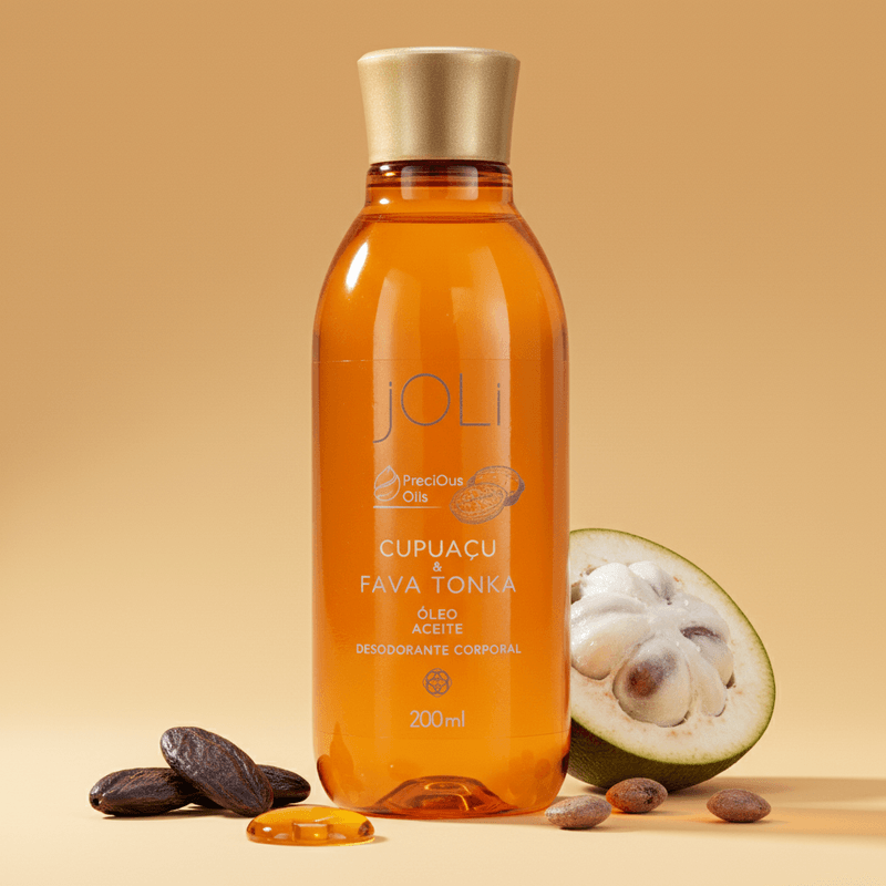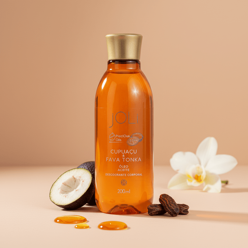 A fórmula do Óleo Joli é enriquecida com as propriedades emolientes e nutritivas da <strong>Manteiga de Cupuaçu</strong> e o perfume quente e ambarado da <strong>Fava Tonka</strong>, conhecidos por promover uma hidratação intensa e duradoura. Sua composição avançada forma uma película protetora que retém a umidade essencial da pele, conferindo maciez imediata, sem deixar aquela sensação oleosa. Este diferencial técnico garante que sua pele permaneça aveludada e protegida por muito mais tempo.