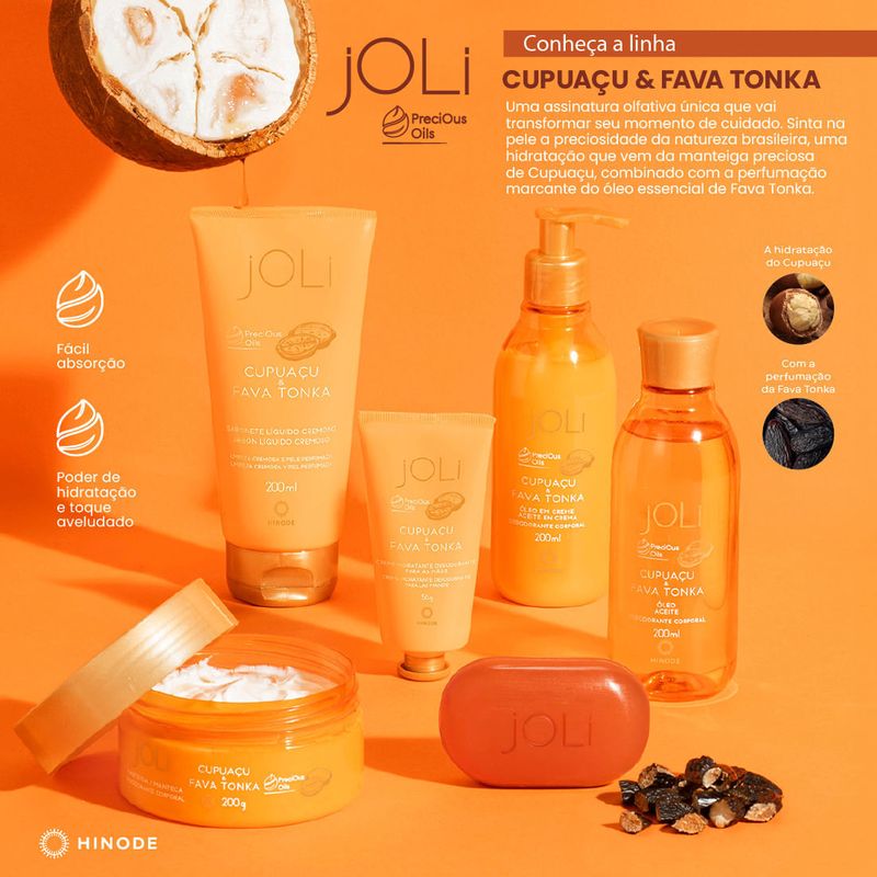 Transforme seu banho em um ritual de puro prazer e cuidado com o exclusivo <strong>Óleo Desodorante Corporal Joli Cupuaçu e Fava Tonka 200ml</strong> da Hinode. Essa essência envolvente celebra a beleza da sua pele, criando uma experiência sensorial que hidrata profundamente enquanto deixa um rastro perfumado e inesquecível. É o toque de sofisticação que faltava na sua rotina de bem-estar, capturando a energia de ingredientes exóticos para realçar o seu brilho natural.