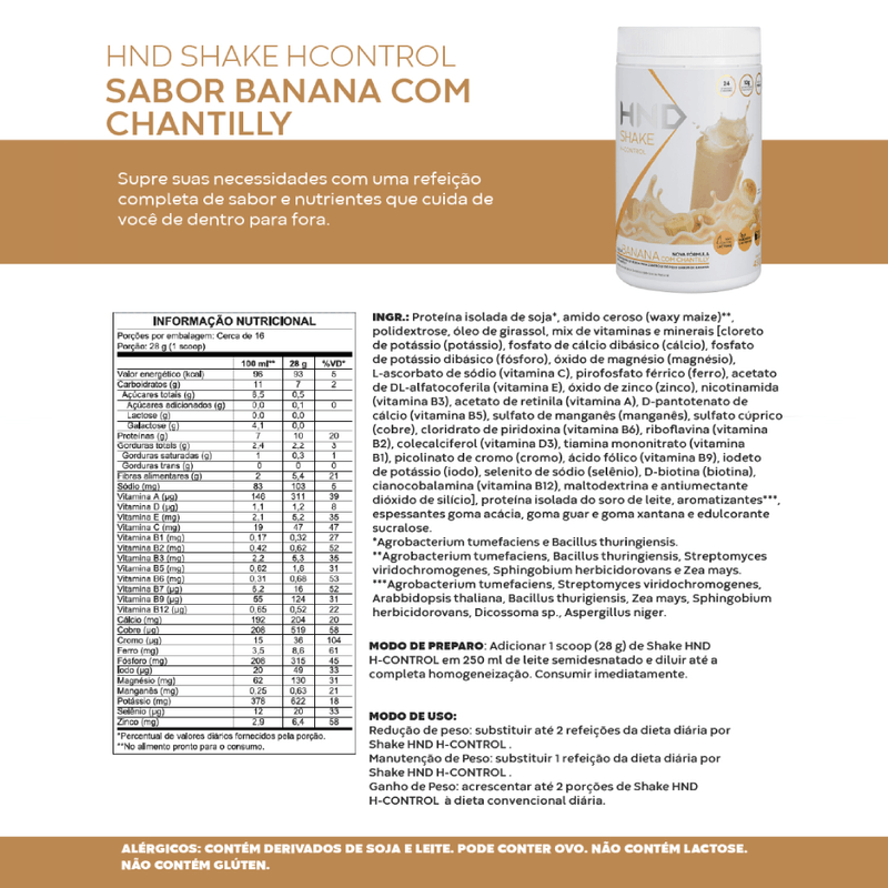 A Hinode traz para você o Shake H-Control Sabor Banana com Chantilly, uma solução perfeita para quem deseja manter o controle de peso sem abrir mão do sabor e da qualidade nutricional. Com 450g, este shake é a combinação ideal de sabor e saúde, formulado especialmente para fornecer um equilíbrio de nutrientes enquanto auxilia na redução da ingestão calórica diária.